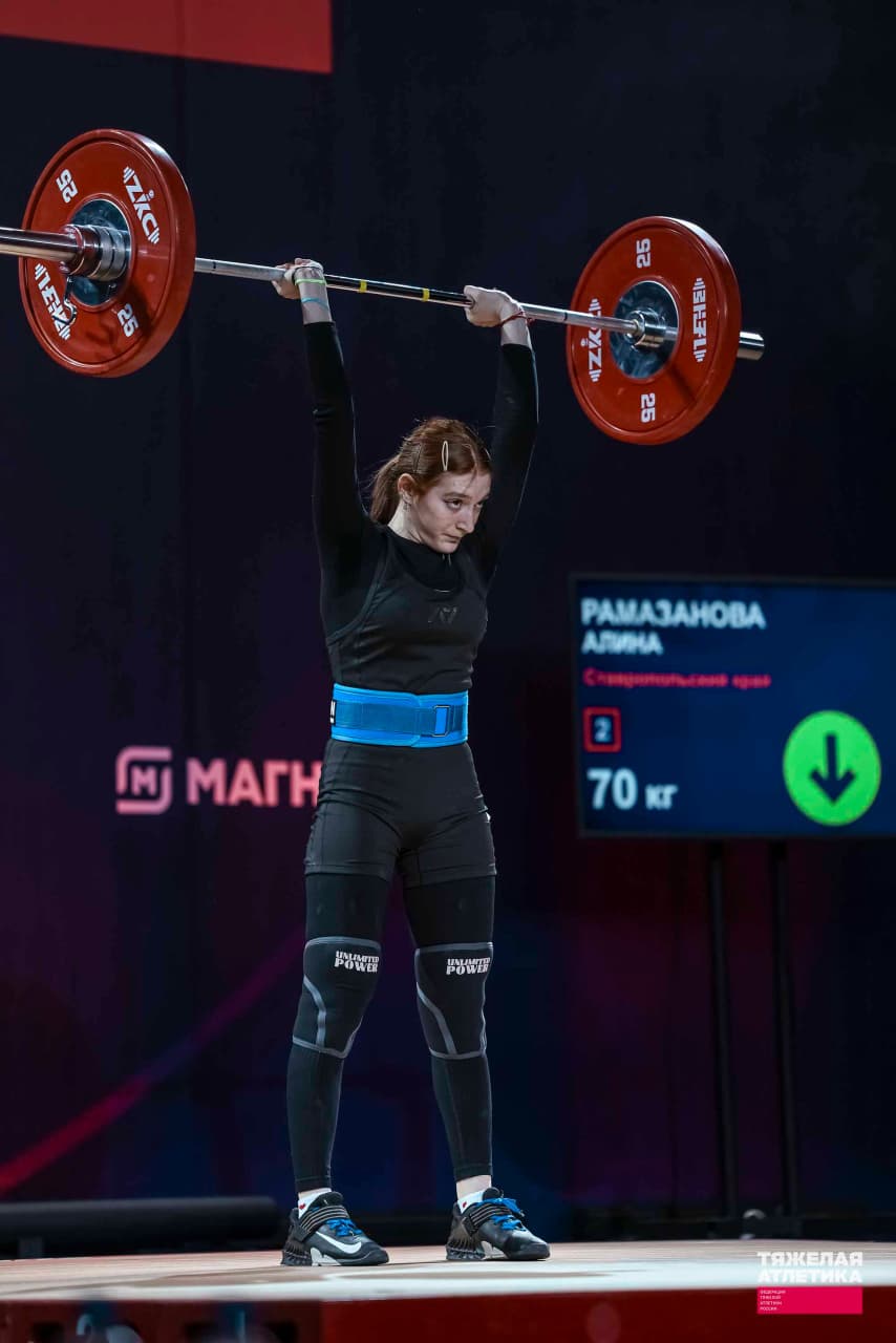 Рамазанова Алина – КМС из г. Буденновска завоевала бронзовую медаль в рывке и 5 место в сумме двоеборья в весовой категории 55 кг с суммой двоеборья – 134 кг, тренер Горчеков Н.В.
